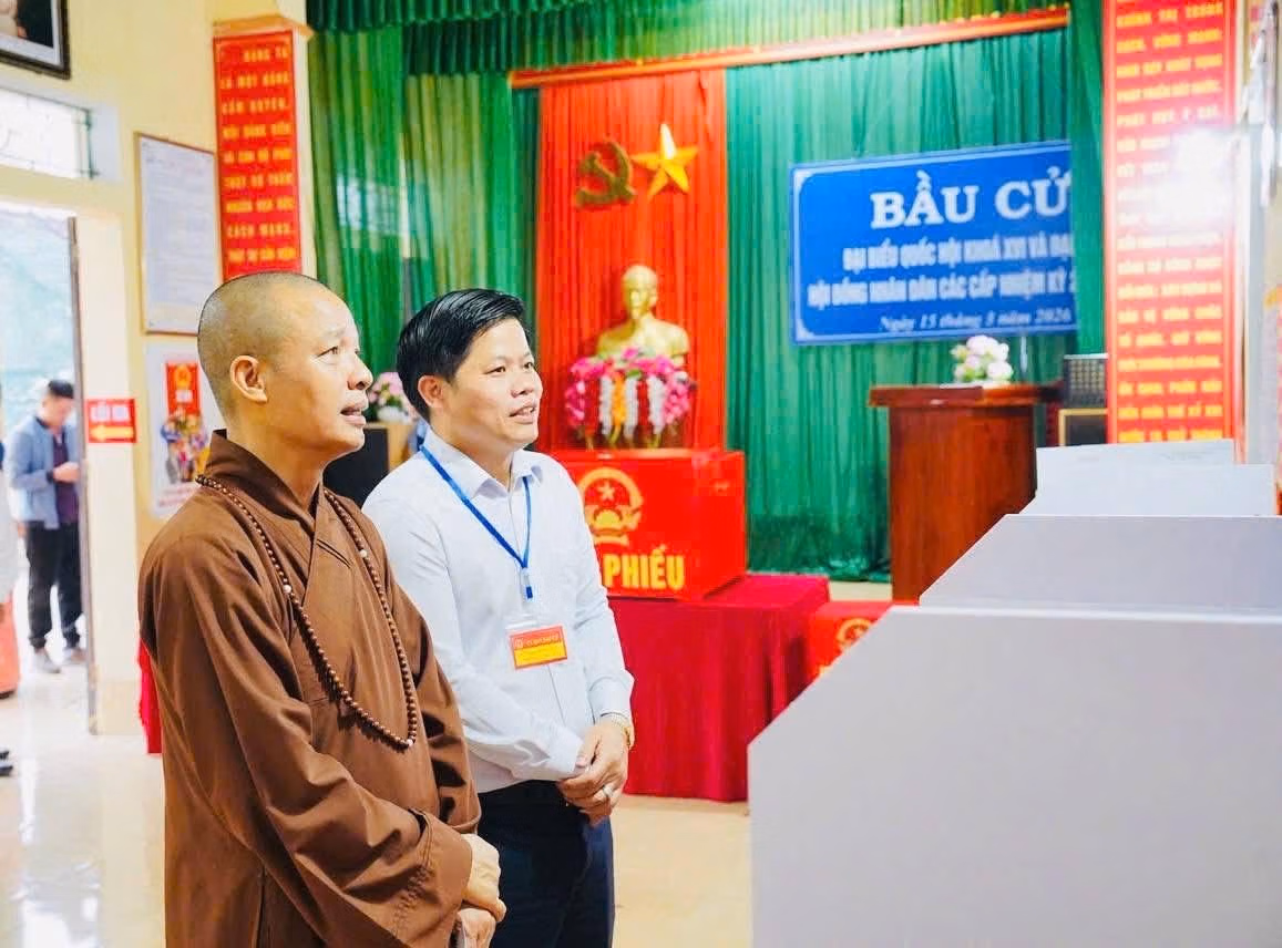 Cũng trong sáng nay, Thượng tọa Thích Minh Quang - Phó Trưởng ban Thường trực BTS GHPGVN tỉnh Ninh Bình, Phó Trụ trì chùa Tam Chúc cũng đã tham gia bầu cử tại xã Khánh Thiện, tỉnh Ninh Bình.