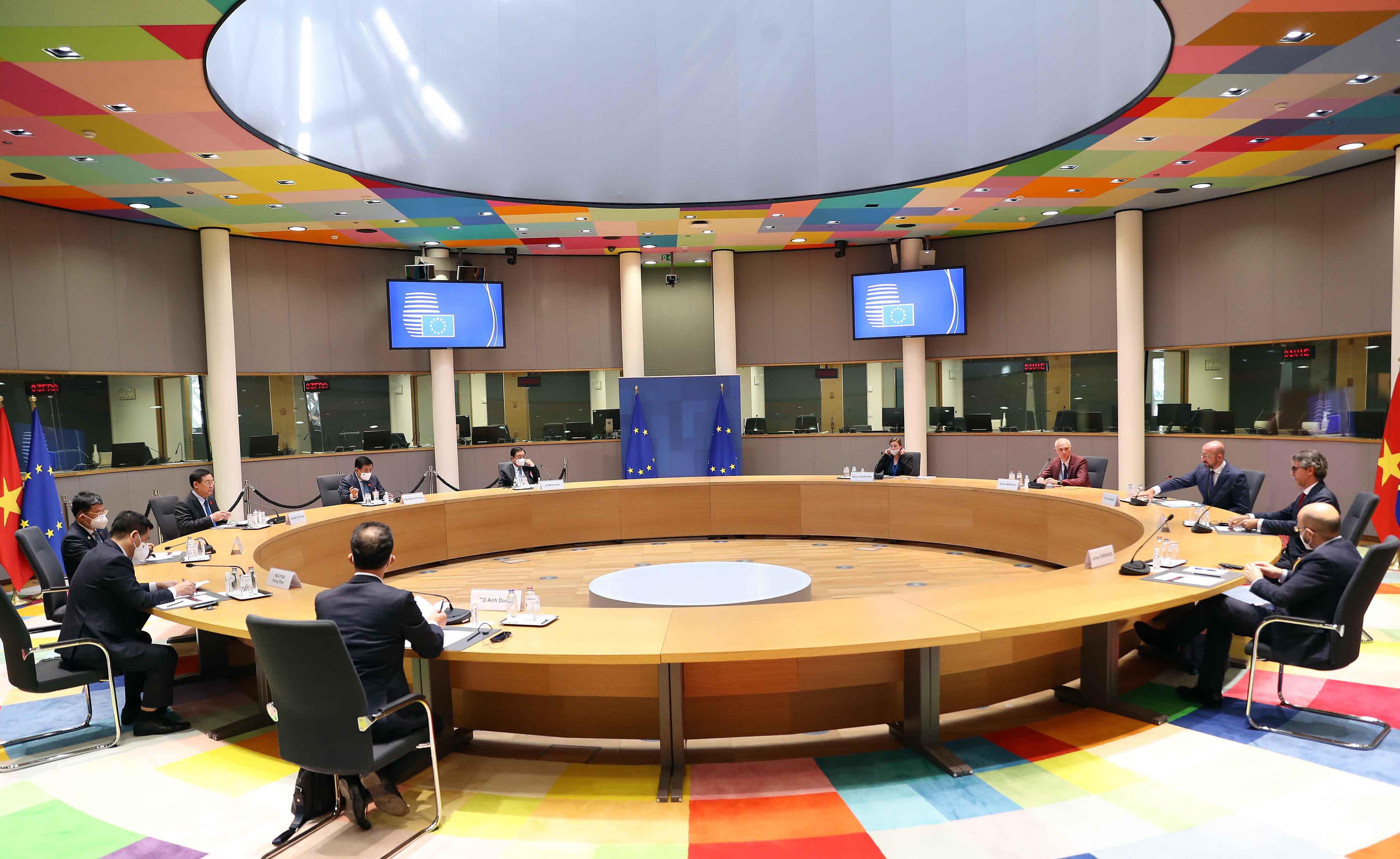 Cho rằng dịch bệnh COVID-19 diễn biến phức tạp trên toàn thế giới đã ảnh hưởng đến tiến độ và hiệu quả của việc thực thi Hiệp định EVFTA (Hiệp định Thương mại tự do Liên minh châu Âu – Việt Nam), Chủ tịch EC nhấn mạnh sắp tới hai bên cần khai thác hết tiềm năng to lớn mà hiệp định này mang lại. Chủ tịch Charles Michel chia sẻ quan điểm về hoà bình và an ninh ở Ấn Độ Dương – Thái Bình Dương, nguyên tắc thượng tôn pháp luật và khẳng định EU mong muốn mở rộng và làm sâu sắc hơn hợp tác với khu vực Đông Nam Á, trong đó có Việt Nam.