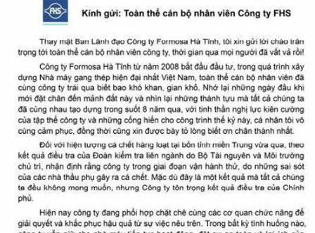 Thừa nhận những sai sót trong quá trình vận hành công ty, lãnh đạo Formosa đã cúi đầu xin lỗi, Đảng, Chính phủ và nhân dân Việt Nam. Trong “tâm thư” tới gửi cán bộ công nhân viên công ty, bức thư cũng bày tỏ quan điểm về kết quả điều tra của Chính phủ Việt Nam: "Mặc dù đây là một kết quả chúng tôi không mong muốn, nhưng công ty tôn trọng kết quả điều tra của Chính phủ”