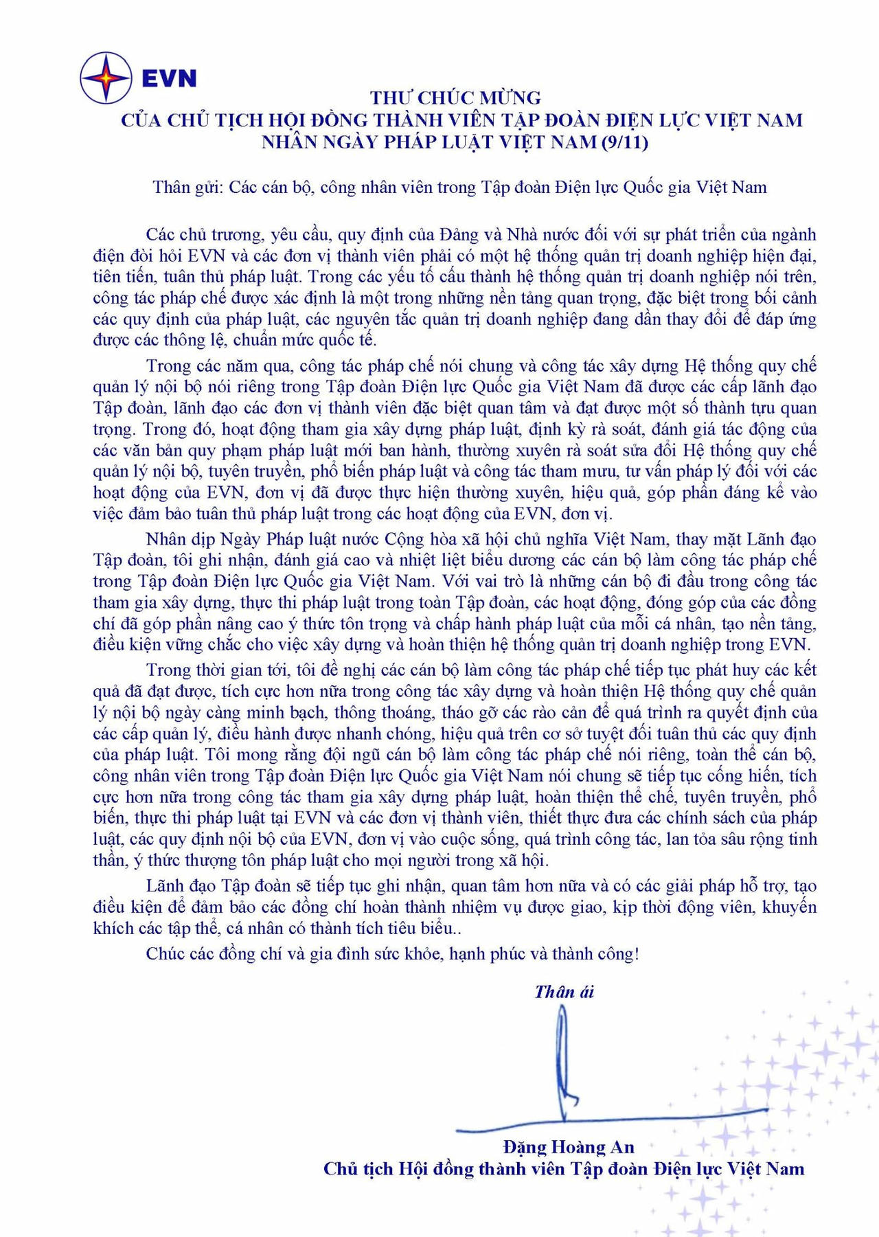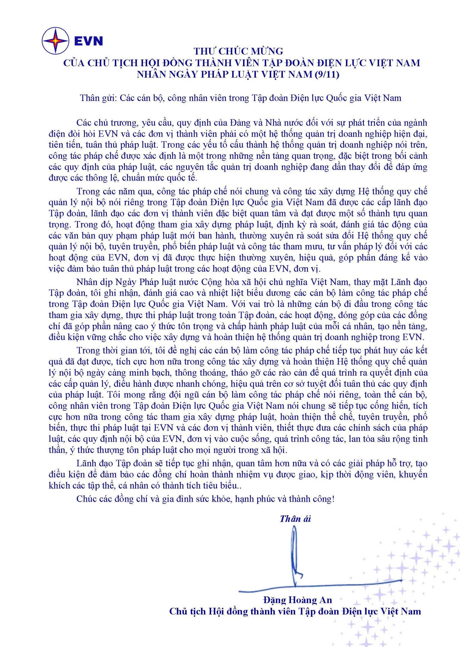 Chủ tịch HĐTV EVN gửi thư chúc mừng tới cán bộ, công nhân viên nhân ngày Pháp luật Việt Nam