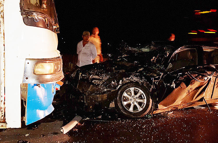 Chiếc ôtô bốn chỗ biến dạng sau khi tông xe chở công nhân.Ảnh: An Nam. |