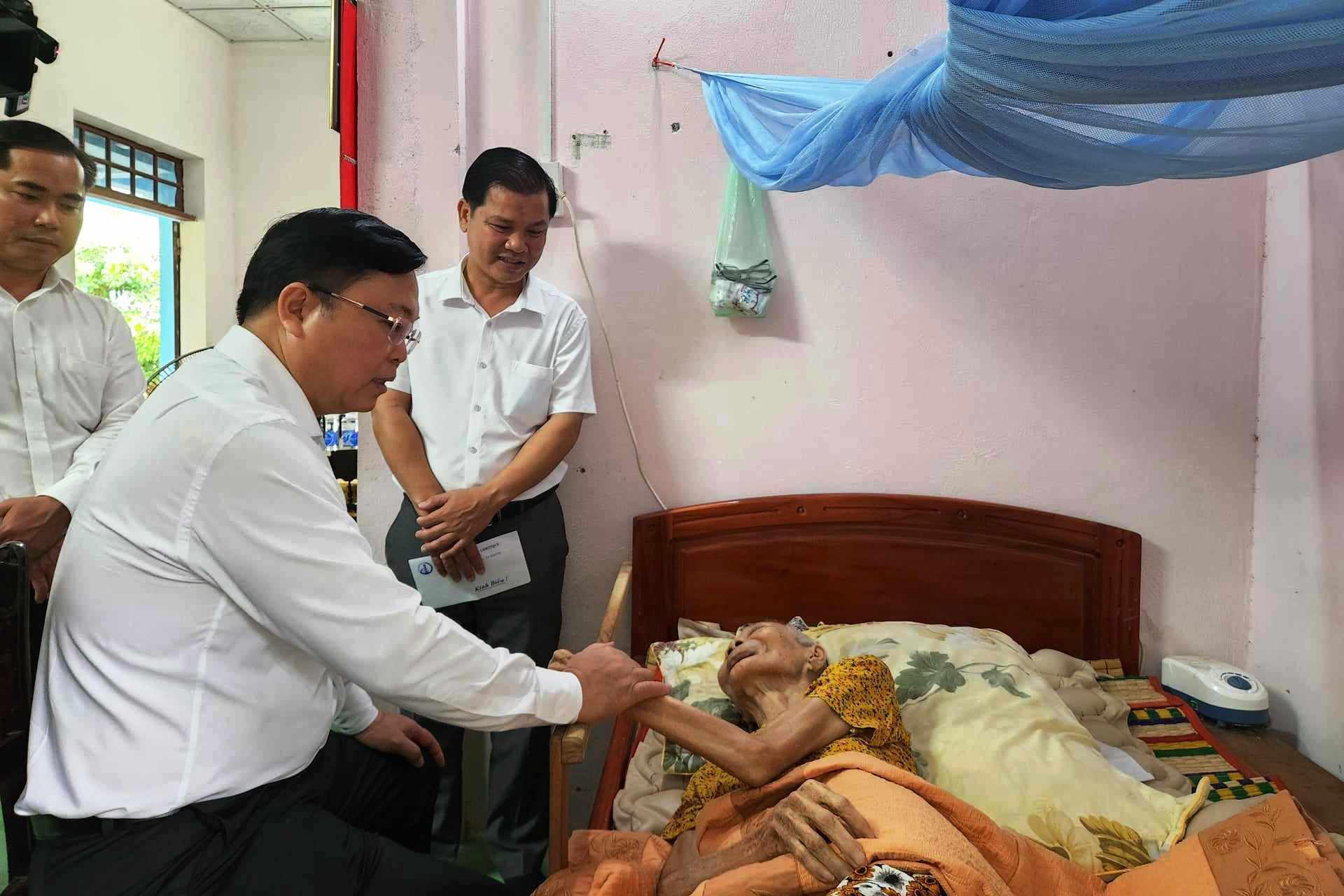 Chủ tịch Ủy ban MTTQ Việt Nam tỉnh Quảng Nam thăm hỏi, tặng quà cho bà Lê Thị Chín. |