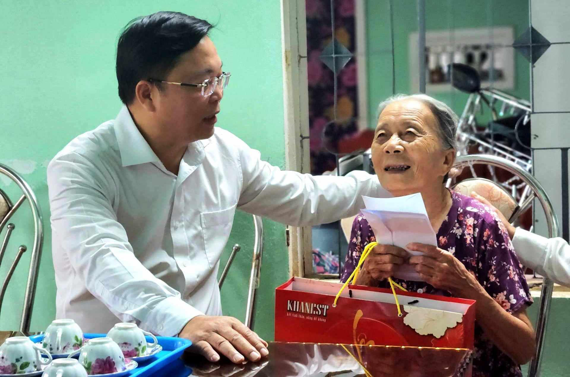 Chủ tịch Ủy ban MTTQ Việt Nam tỉnh Quảng Nam Lê Trí Thanh tặng quà bà Nguyễn Thị Thiên, vợ liệt sĩ. |