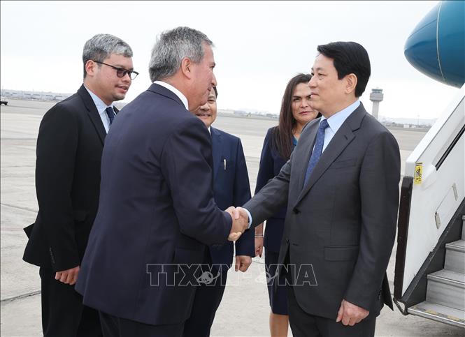 Chủ tịch nước Lương Cường đến sân bay quốc tế Jorge Chávez ở thủ đô Lima. Ảnh: Lâm Khánh/TTXVN |