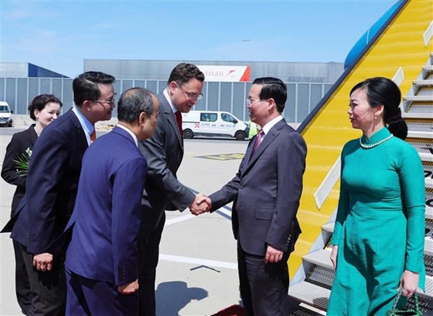 Lễ đón Chủ tịch nước Võ Văn Thưởng và Phu nhân tại Sân bay Quốc tế Vienna (Áo) chiều 27/3/2023 (giờ địa phương). (Ảnh: Thống Nhất/TTXVN)