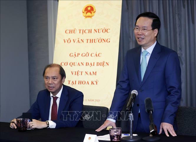 Nhấn mạnh đường lối đối ngoại đa dạng hóa, đa phương hóa trong quan hệ quốc tế của Đảng, Nhà nước, Chủ tịch nước Võ Văn Thưởng cho biết thời gian qua, các hoạt động đối ngoại của Việt Nam diễn ra hết sức sôi động, tích cực và hiệu quả, nâng cao vai trò, vị thế, uy tín của Việt Nam trên trường quốc tế. Chủ tịch nước đánh giá cao sự đóng góp của ngành ngoại giao đối với thành quả to lớn đó, trong đó có các cơ quan đại diện ngoại giao Việt Nam tại Hoa Kỳ. Thời gian qua, dù gặp nhiều khó khăn, các cơ quan đại diện Việt Nam tại Hoa Kỳ đã nỗ lực thúc đẩy quan hệ song phương trong nhiều lĩnh vực, đặc biệt là góp phần chuẩn bị tốt cho việc nâng cấp quan hệ Việt Nam - Hoa Kỳ lên Đối tác Chiến lược Toàn diện; tham gia chuẩn bị tốt cho chương trình tham dự Tuần lễ Cấp cao APEC của Chủ tịch nước và các bộ, ngành, địa phương.