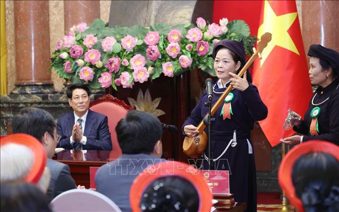Chủ tịch nước Lương Cường gặp mặt đại biểu phụ nữ cao tuổi tiêu biểu toàn quốc. Ảnh: Lâm Khánh/ TTXVN.
