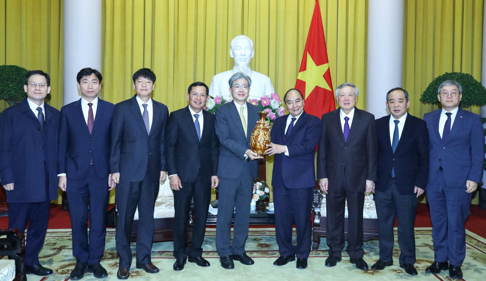 Chủ tịch nước Nguyễn Xuân Phúc chụp ảnh lưu niệm với Bộ trưởng Bộ Quản lý Toà án Quốc gia, Toà án Tối cao Hàn Quốc Kim Sang-Hwan và các đại biểu. Ảnh: VPCTN