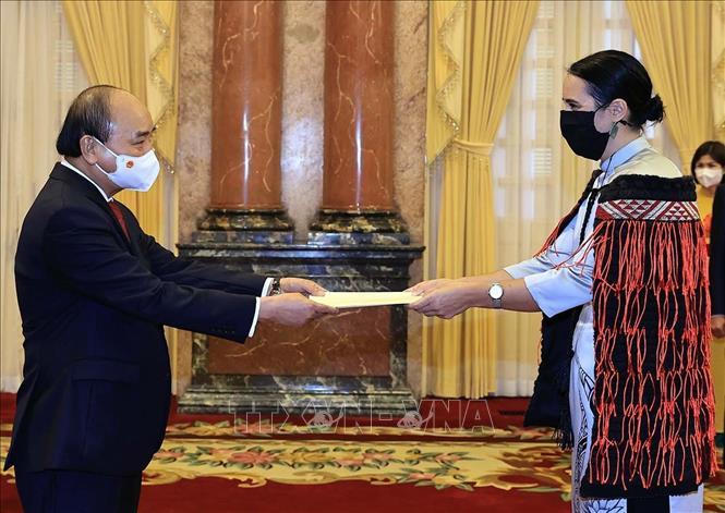 Chủ tịch nước Nguyễn Xuân Phúc và Đại sứ New Zealand Tredene Dobson tại Lễ trình Quốc thư. Ảnh: TTXVN |