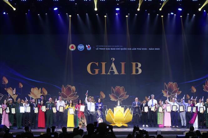Các tác giả, nhóm tác giả nhận Giải B - Giải báo chí Quốc gia lần thứ XVIII. Ảnh: Tuấn Anh/TTXVN
