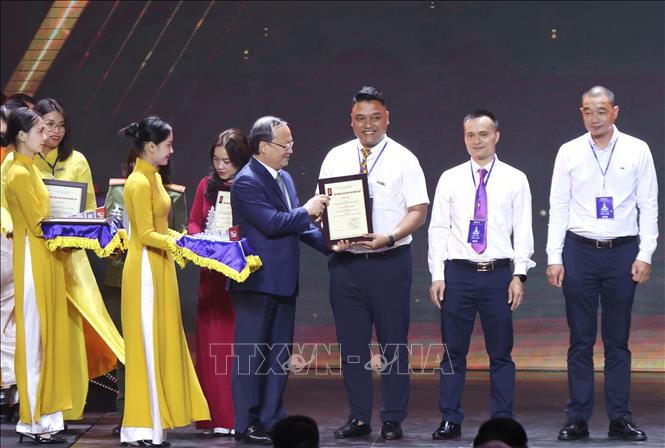 Chủ tịch nước Tô Lâm và Trưởng ban Tuyên giáo Trung ương Nguyễn Trọng Nghĩa trao giải A cho các tác giả, nhóm tác giả. Ảnh: Tuấn Anh/TTXVN