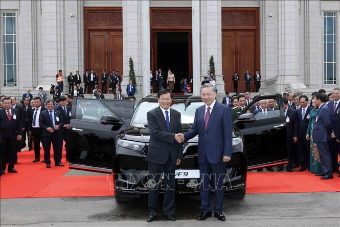 Chủ tịch nước Tô Lâm trao xe ô tô Vinfast VF9 cho Tổng Bí thư, Chủ tịch nước Lào Thongloun Sisoulith. Ảnh: Nhan Sáng/TTXVN