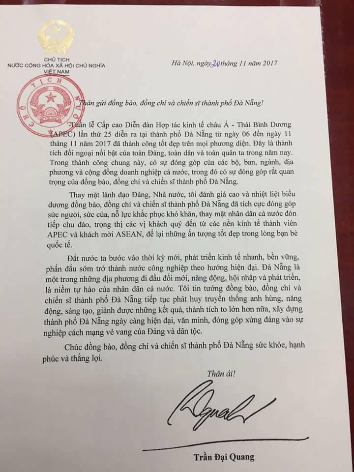 Trong bức thư, Chủ tịch nước thay mặt lãnh đạo Đảng, Nhà nước, đánh giá cao và nhiệt liệt biểu dương đồng bào, đồng chí và chiến sĩ TP. Đà Nẵng đã tích cực đóng góp sức người, sức của, nỗ lực khắc phục khó khăn, thay mặt nhân dân cả nước đón tiếp chu đáo, trọng thị các vị khách quý đến từ các nền kinh tế thành viên APEC và khách mời ASEAN, để lại những ấn tượng tốt đẹp trong lòng bạn bè quốc tế.