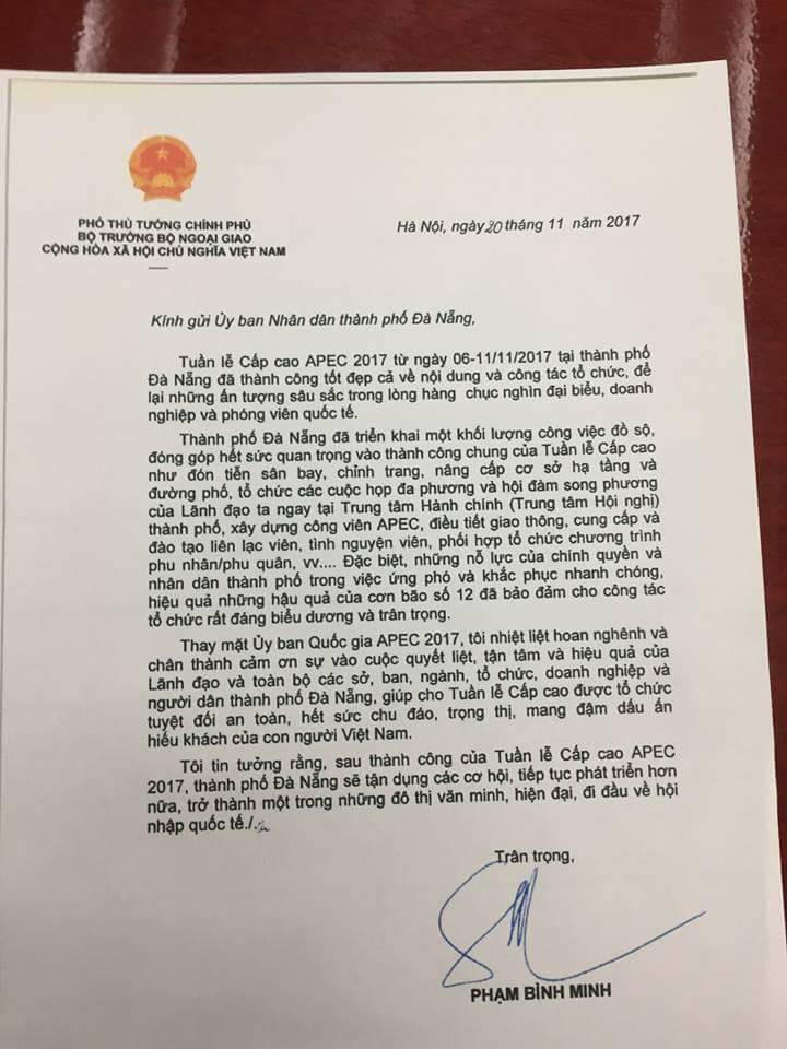 Nhân dịp này, ông Nguyễn Minh Vũ, Phó trưởng ban thường trực Ban Thư ký Ủy ban quốc gia APEC cũng đọc toàn văn thư của Phó Thủ tướng, Bộ trưởng Bộ Ngoại giao, Chủ tịch Ủy ban quốc gia APEC Phạm Bình Minh gửi UBND Tp Đà Nẵng.