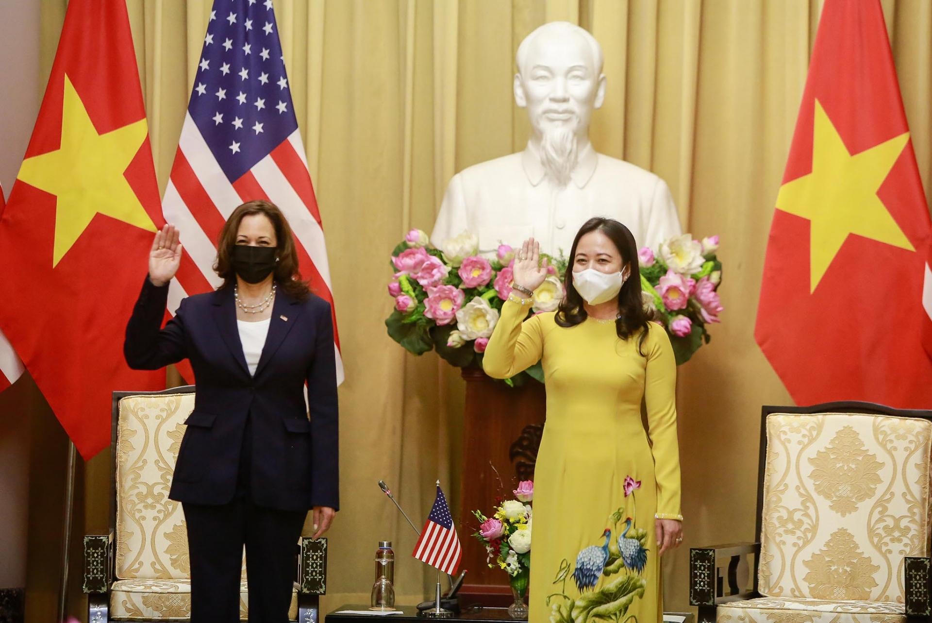 Phó Chủ tịch nước Võ Thị Ánh Xuân tiếp đón Phó Tổng thống Mỹ Kamala Harris. |