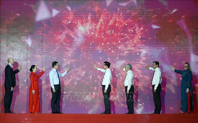 Chủ tịch nước Võ Văn Thưởng và các đại biểu thực hiện nghi thức phát động Tháng nhân đạo năm 2023 và khởi động phong trào “Người tốt, việc thiện - chung sức xây dựng cộng đồng nhân ái”. Ảnh: Thống Nhất/TTXVN