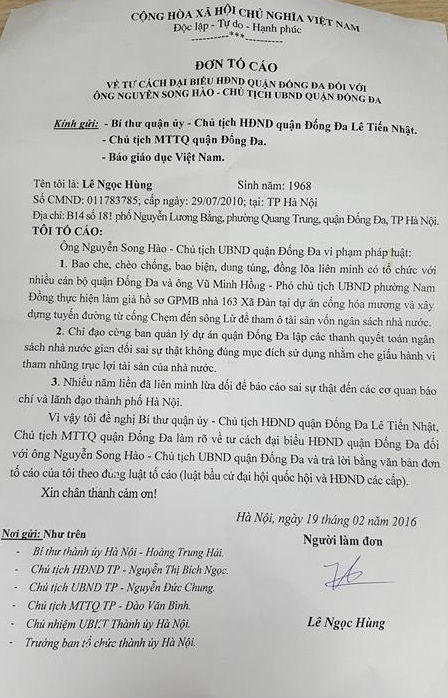 Liên quan đến việc tổ chức hội đồng nhân dân, Ủy ban Mặt trận Tổ quốc Việt Nam quận Đống Đa vừa nhận được đơn tố cáo về tư cách đại biểu hội đồng nhân dân đối với ông Nguyễn Song Hào, Chủ tịch UBND quận Đống Đa.