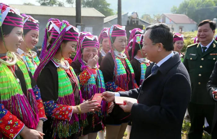 Ông Cao Tường Huy lì xì may mắn cho bà con dân tộc thiểu số xã Hải Sơn. |