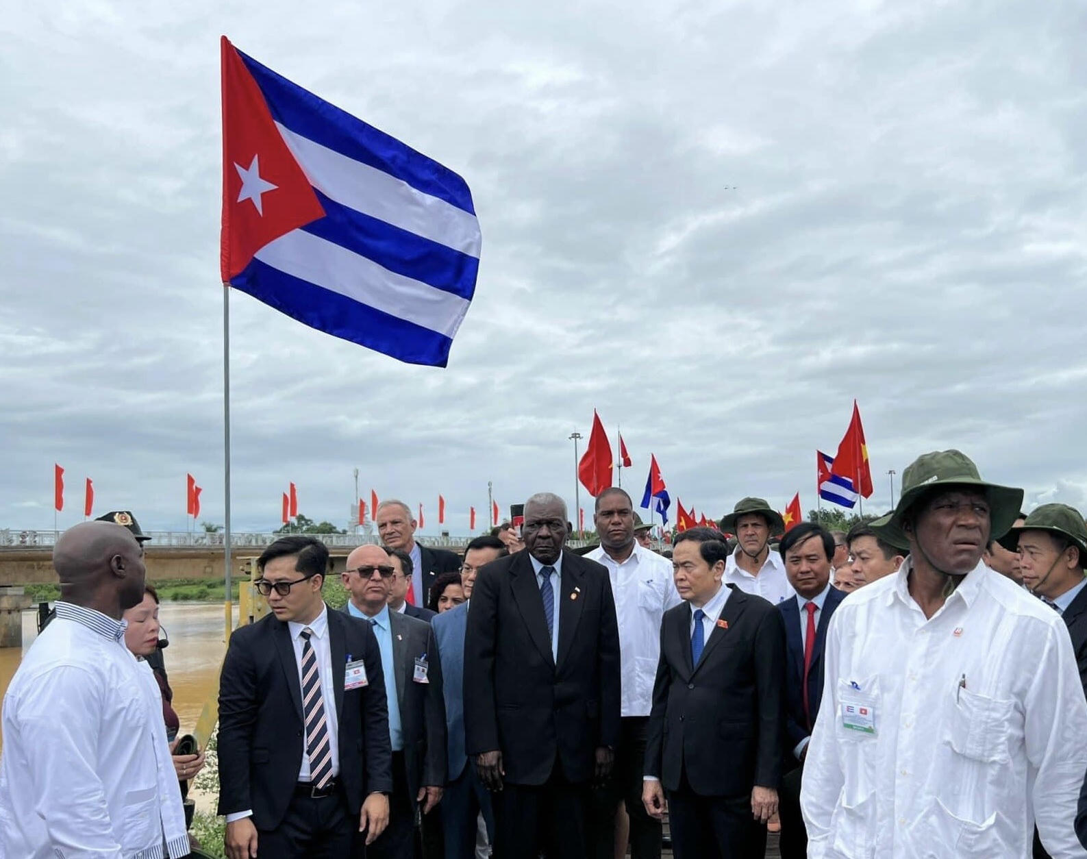 Chủ tịch Quốc hội Chính quyền Nhân dân Cuba Esteban Lazo Hernandez và Phó Chủ tịch Thường trực Quốc hội Trần Thanh Mẫn tham quan cầu Hiền Lương, sông Bến Hải. |