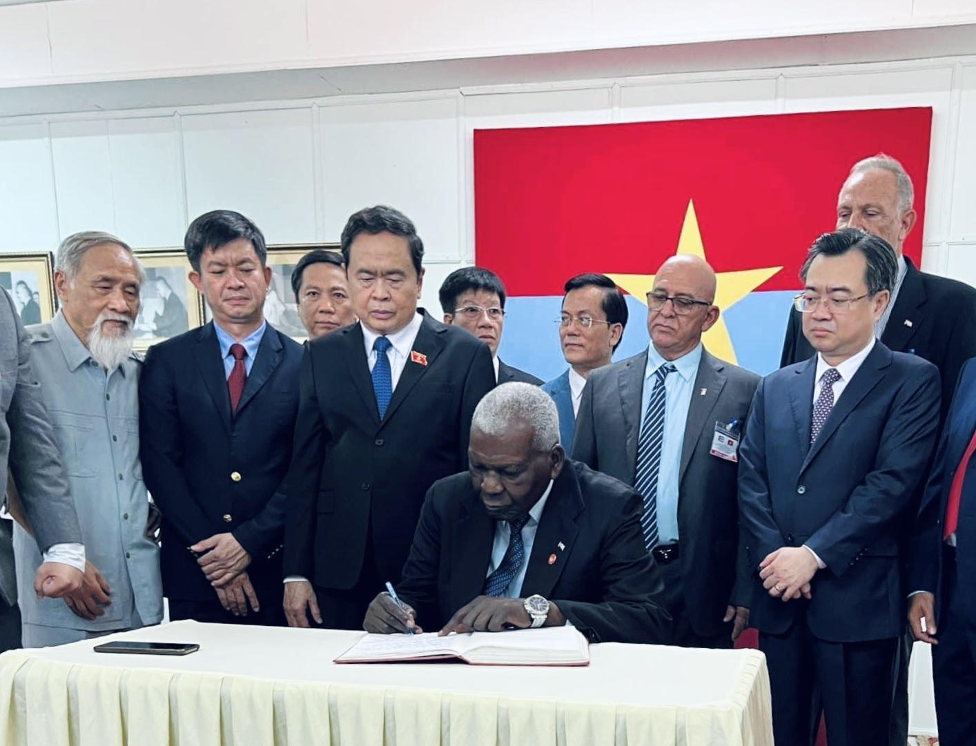 Chủ tịch Quốc hội Cuba Esteban Lazo Hernandez ghi vào sổ cảm tưởng tại di tích Trụ sở Chính phủ Cách mạng Lâm thời Cộng hòa miền Nam Việt Nam. |