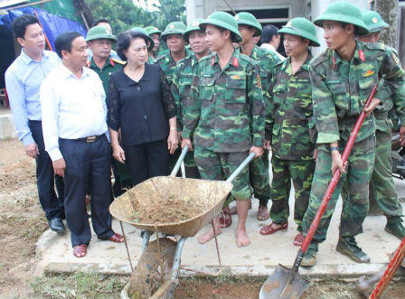 Tiếp đó, Chủ tịch Quốc hội Nguyễn Thị Kim Ngân và đoàn công tác đã đến thăm hỏi, động viên các cán bộ, chiến sĩ thuộc lực lượng Quân khu 4, Biên phòng tỉnh Hà Tĩnh, Huyện đội huyện Hương Khê… đang trực tiếp tham gia giúp đỡ bà con nhân dân xã Hòa Hải khắc phục hậu quả sau lũ lụt để sớm ổn định cuộc sống.