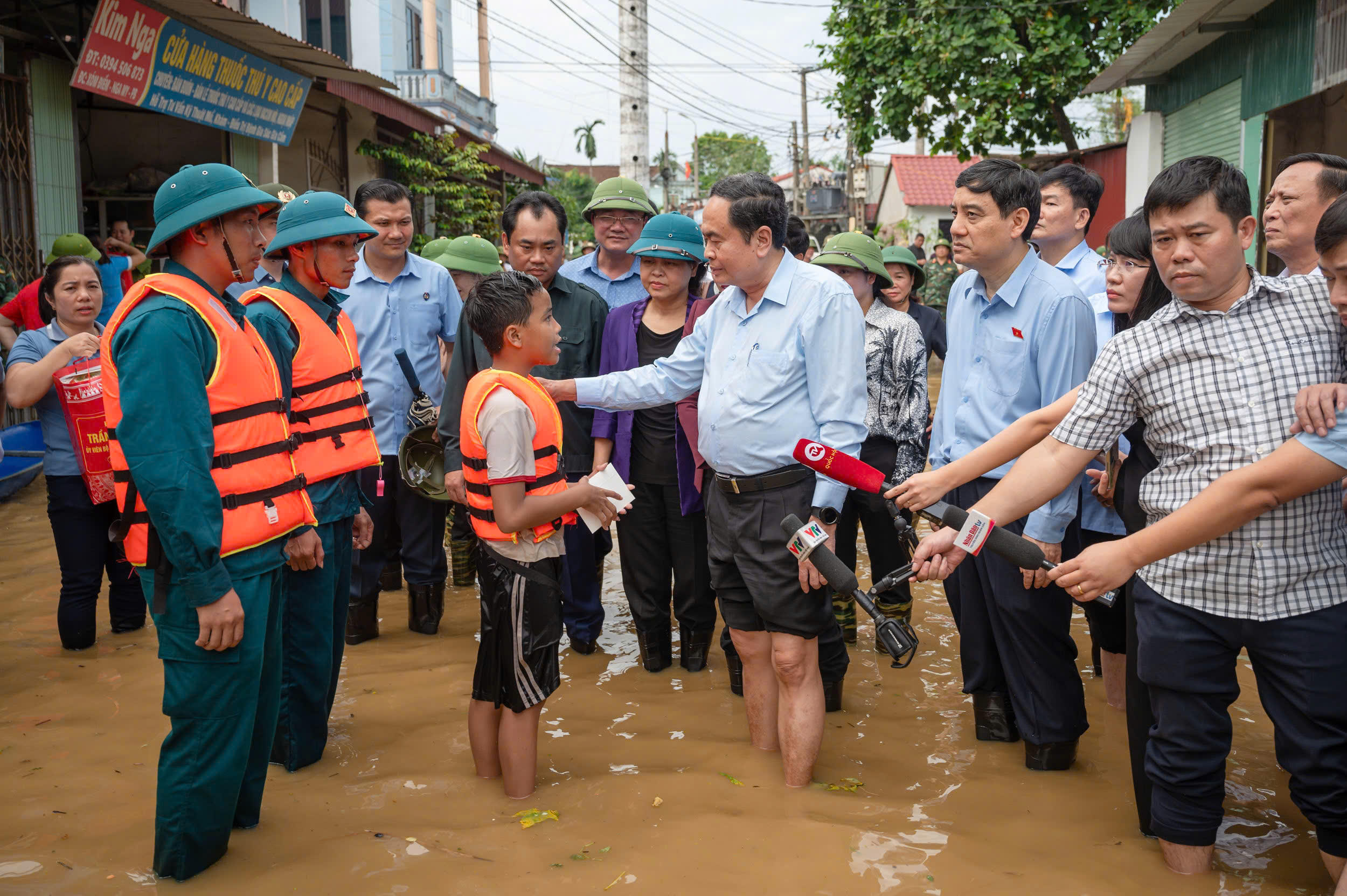 Tiếp đó, tại Thái Nguyên, Chủ tịch Quốc hội Trần Thanh Mẫn và Đoàn công tác đã đi kiểm tra thực địa và động viên bà con nhân dân xã Nga My, một trong những nơi là “rốn lũ” của huyện Phú Bình với mực nước lũ dâng cao trong những ngày qua.