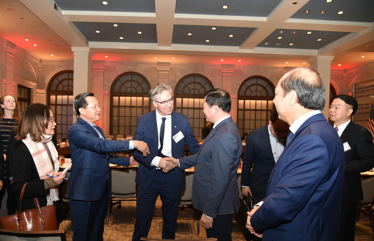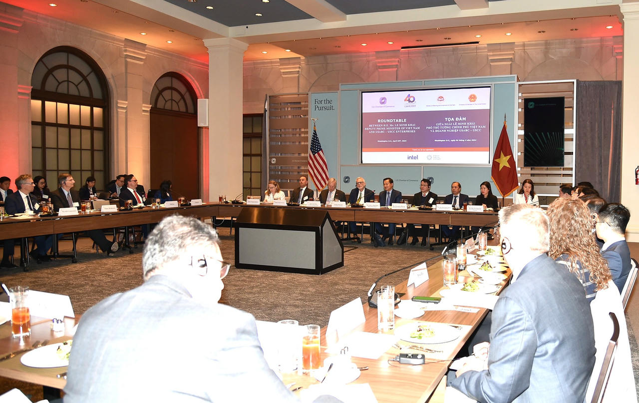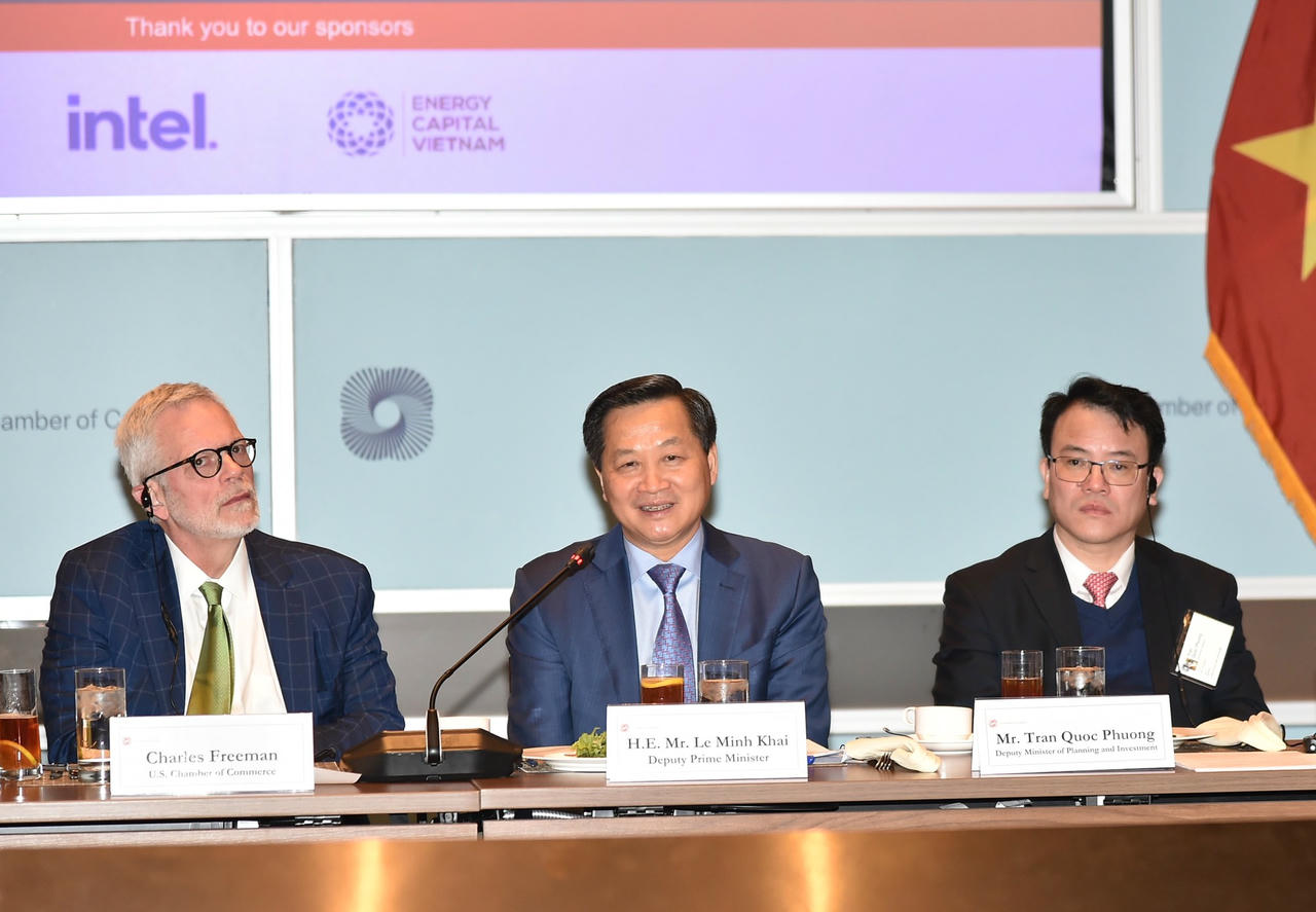 Tham dự Tọa đàm doanh nghiệp do Phòng Thương mại Hoa Kỳ (USCC) và Hội đồng kinh doanh Hoa Kỳ - ASEAN (USABC) đồng chủ trì với sự tham gia của gần 30 doanh nghiệp hàng đầu của Hoa Kỳ trong lĩnh vực công nghệ, năng lượng tái tạo, hàng không, y tế…, Phó Thủ tướng đánh giá cao các doanh nghiệp Hoa Kỳ đã quan tâm đầu tư tại Việt Nam.