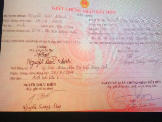 Nói về Giấy chứng nhận kết hôn của chị H có thể hiện chữ ký của ông Nguyễn Xuân Hiền, Phó Chủ tịch UBND thị trấn Đông Anh do phóng viên cung cấp, ông Khánh cho biết đây là giấy chứng nhận kết hôn giả mạo được phô tô và chỉnh sửa. “Tôi tên là Nguyễn Quốc Khánh sinh ngày 18/9/1967 còn giấy chứng nhận kết hôn tên là Nguyễn Quốc Khanh sinh ngày 18/8/1967.
