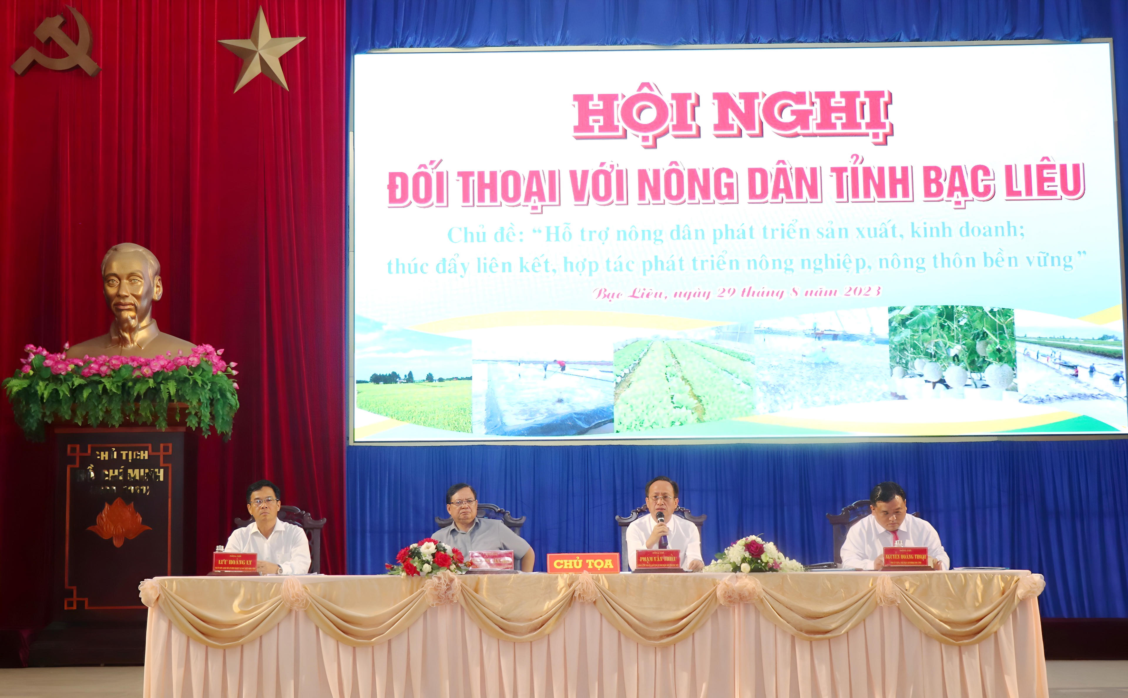 (PLVN) - Ngày 29/8, ông Phạm Văn Thiều - Phó Bí thư Tỉnh ủy, Chủ tịch UBND tỉnh Bạc Liêu, chủ trì Hội nghị đối thoại với cán bộ, hội viên, nông dân với chủ đề: “Hỗ trợ nông dân phát triển sản xuất, kinh doanh; thúc đẩy liên kết, hợp tác phát triển nông nghiệp, nông thôn bền vững”.