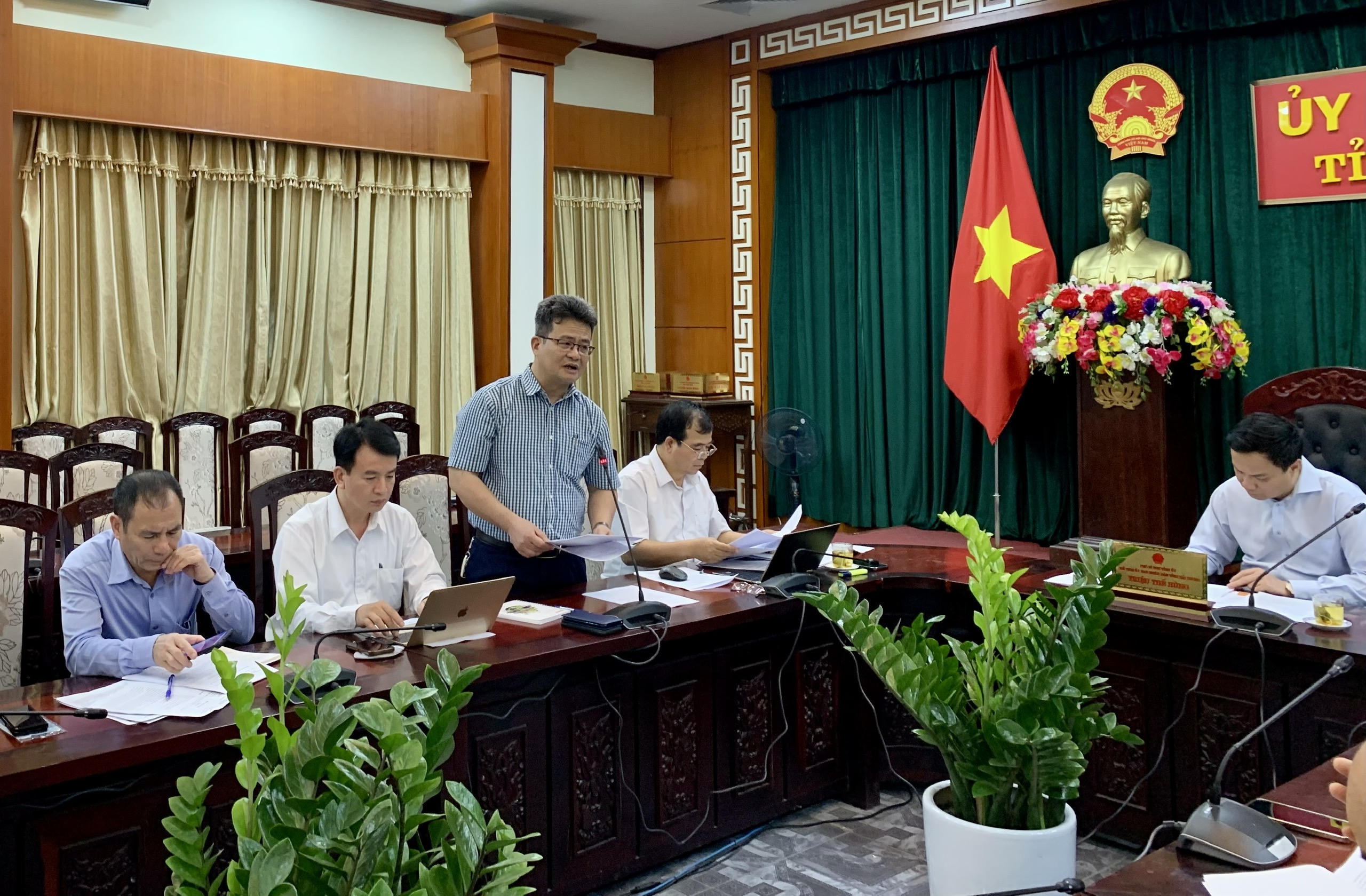 Ông Nguyễn Quang Cảnh, Giám đốc Sở Y tế tỉnh Hải Dương báo cáo tình hình dịch bệnh COVID-19 trên địa bàn tỉnh tại cuộc họp vừa qua. |
