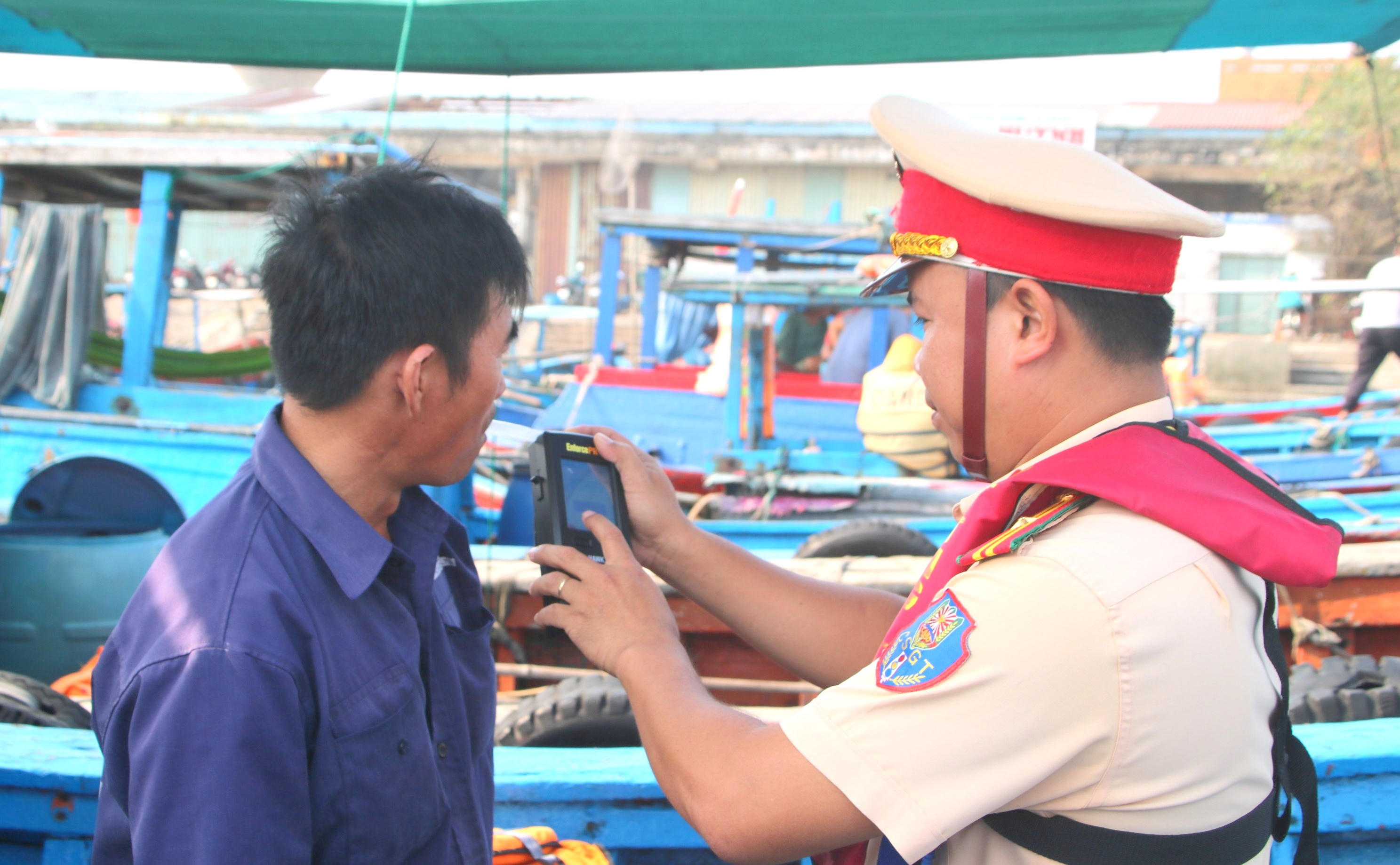 | Lực lượng cảnh sát giao thông đường thủy Bình Định kiểm tra nồng độ cồn đối với người lái phương tiện thủy nội địa. |
