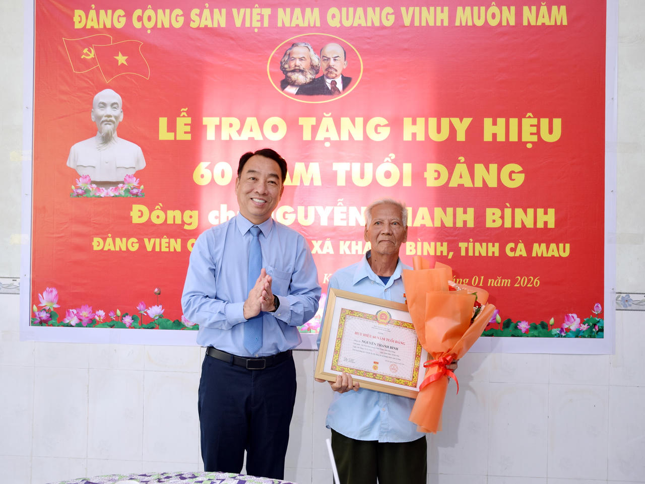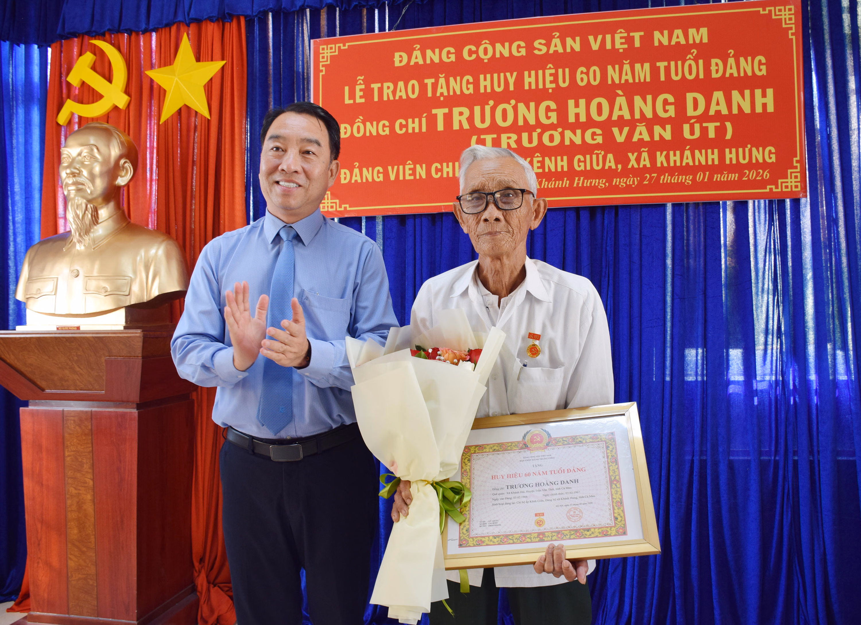 Tại xã Khánh Hưng, ông Lữ Quang Ngời - Chủ tịch UBND tỉnh Cà Mau đã trao Quyết định của Ban Thường vụ Tỉnh ủy và Huy hiệu 60 năm tuổi Đảng cho đảng viên Trương Hoàng Danh (SN 1943), hiện đang sinh hoạt tại Chi bộ ấp Kênh Giữa, Đảng bộ xã Khánh Hưng. Ông Trương Hoàng Danh được kết nạp vào Đảng ngày 3/2/1966, chính thức ngày 3/2/1967 và được trao tặng Huy hiệu 60 năm tuổi Đảng vào dịp 3/2/2026.