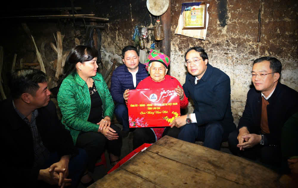 | Chủ tịch UBND tỉnh Lào Cai Trịnh Xuân Trường cùng đoàn công tác thăm và tặng quà Tết gia đình bà Lý A Say, 100 tuổi, trú tại thôn Phù Lao Chải, xã A Mú Sung. |