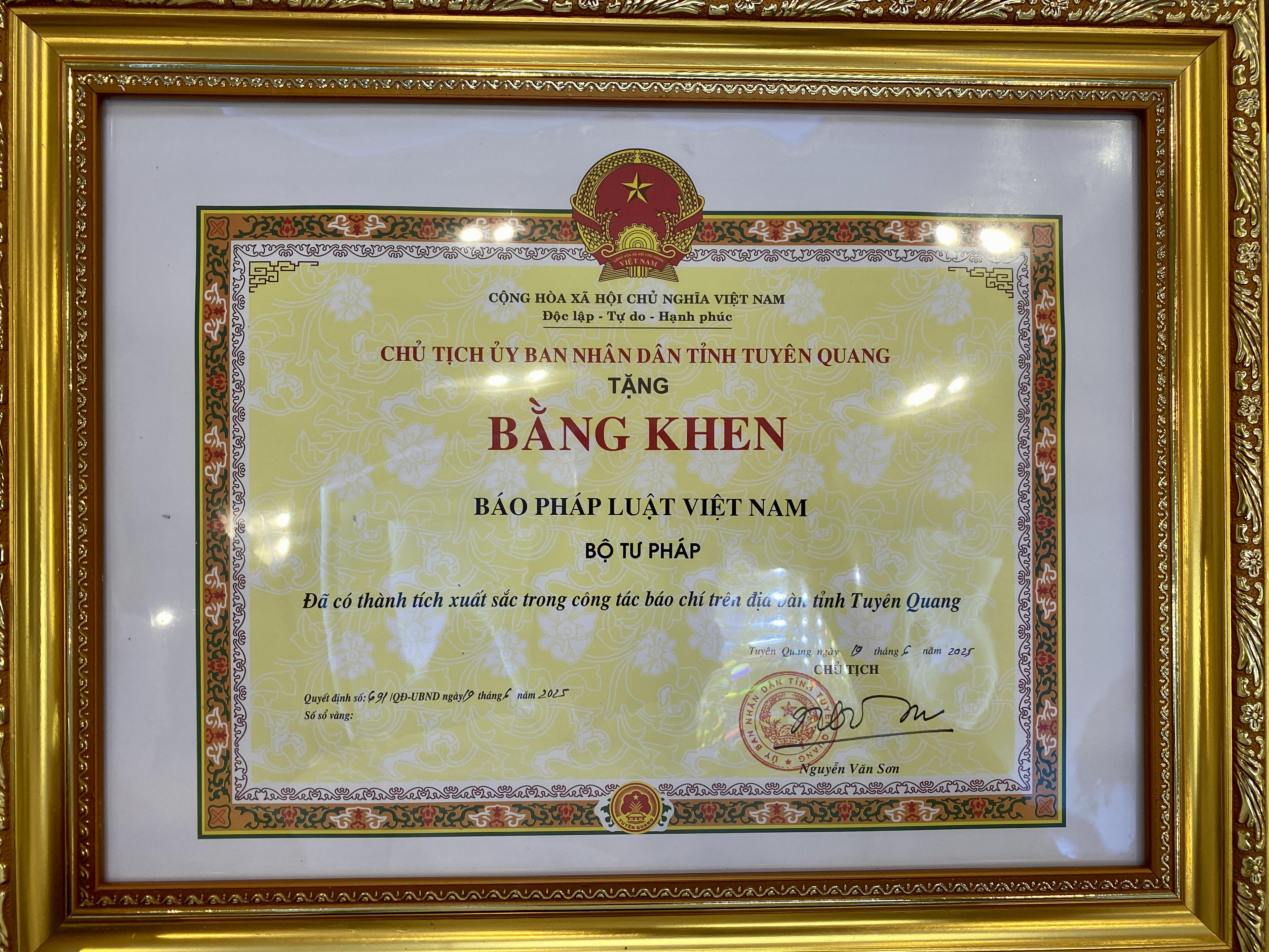 Bằng khen Chủ tịch UBND tỉnh Tuyên Quang tặng Báo Pháp luật Việt Nam vì đã có thành tích xuất sắc trong công tác báo chí trên địa bàn tỉnh Tuyên Quang. (Ảnh: Thanh Tùng) |