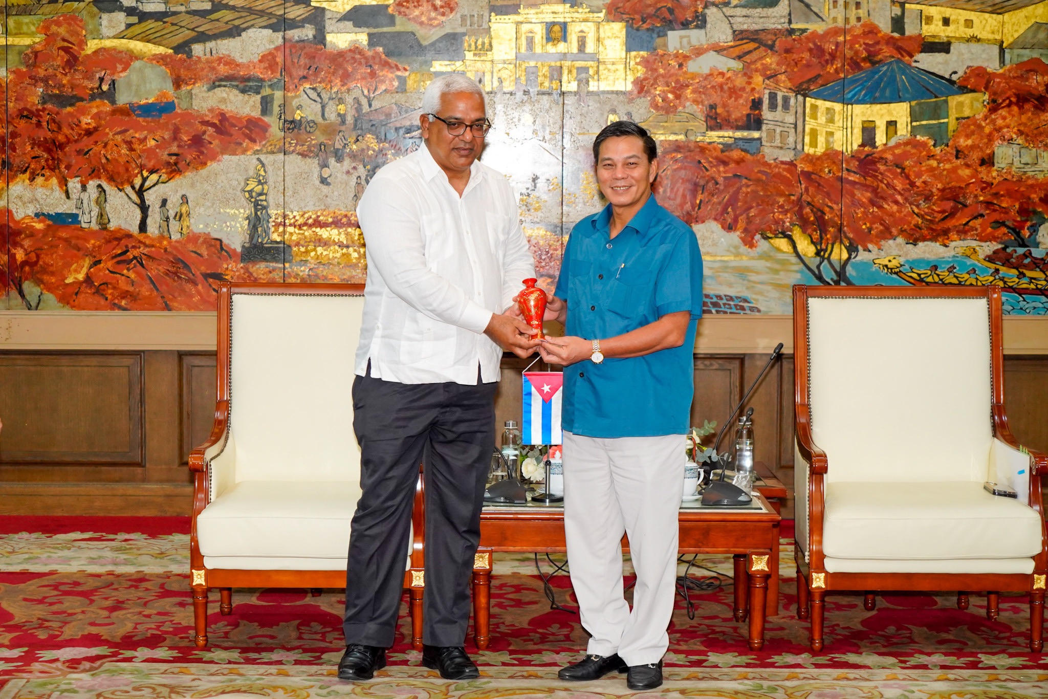 Chủ tịch UBND thành phố và Đoàn công tác Bộ Tư pháp Cuba trao tặng lưu niệm. |