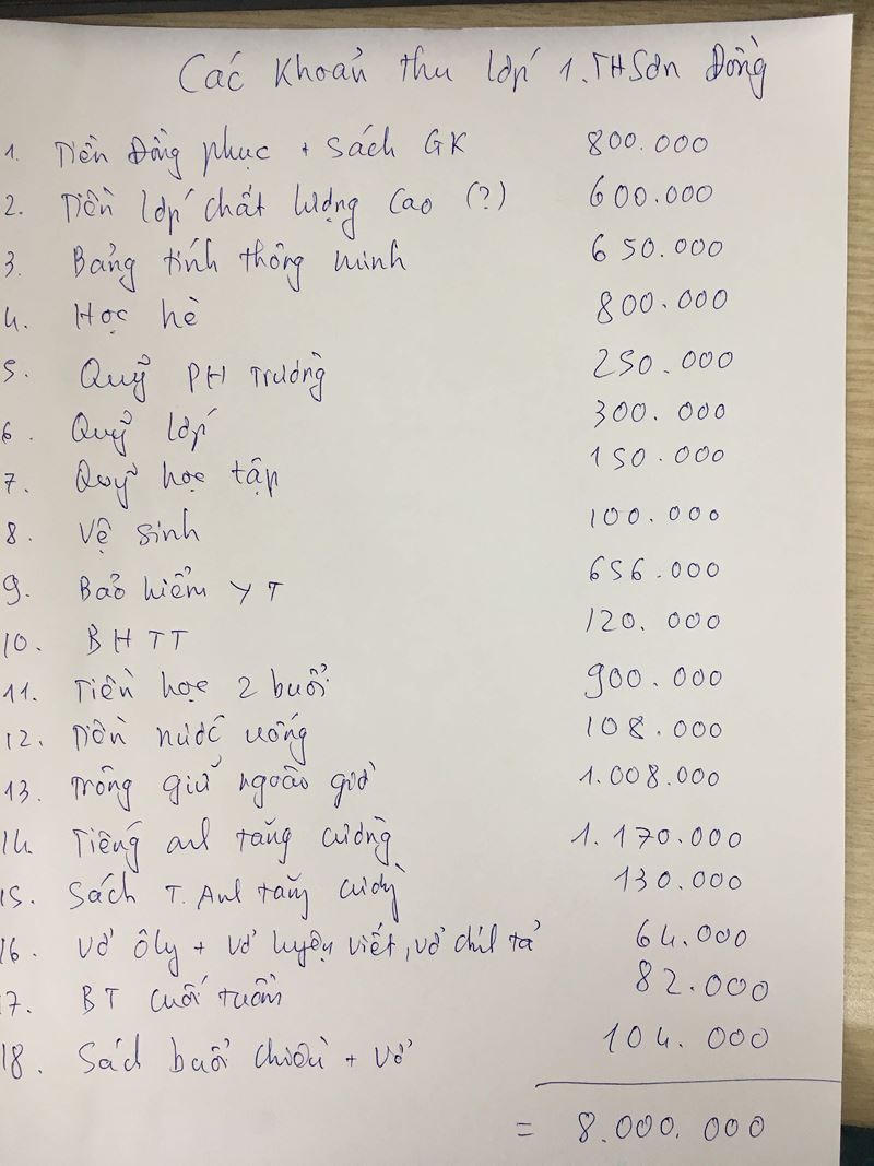 Đáng chú ý, trong 18 khoản thu này, nhiều phụ huynh nhận thấy có nhiều khoản tiền vô lý như: Tiền đồng phục và sách giáo khoa 800.000 đồng; Tiền lớp chất lượng cao 600.000 đồng; Bảng tính thông minh 650.000 đồng;
