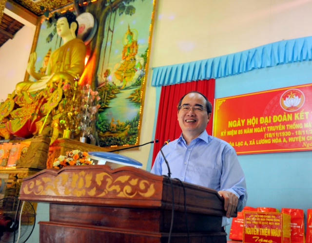 Chia vui với bà con ấp Hoà Lạc A (tỉnh Trà Vinh), Chủ tịch Ủy ban Trung ương MTTQ Việt Nam Nguyễn Thiện Nhân cho rằng việc tổ chức ngày hội đại đoàn kết trong chùa, khi đồng bào cùng với các vị lãnh đạo, các vị sư sãi cùng hát vang Quốc ca trong lễ chào cờ mang lại cảm xúc rất đặc biệt.
