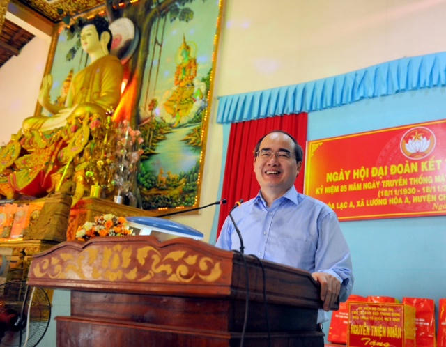 Chia vui với bà con ấp Hoà Lạc A, Chủ tịch Ủy ban Trung ương MTTQ Việt Nam Nguyễn Thiện Nhân cho rằng việc tổ chức ngày hội đại đoàn kết trong chùa, khi đồng bào cùng với các vị lãnh đạo, các vị sư sãi cùng hát vang Quốc ca trong lễ chào cờ mang lại cảm xúc rất đặc biệt.