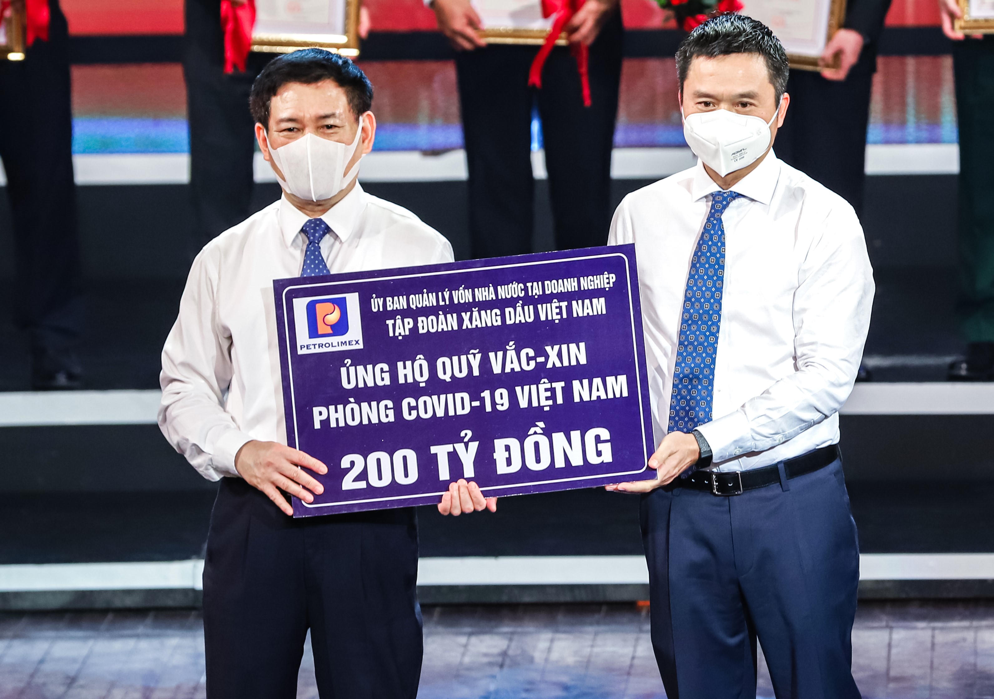 Chủ tịch Petrolimex Phạm Văn Thanh (bên phải) ủng hộ Quỹ vắc xin phòng, chống Covid-19 hồi năm 2021 |