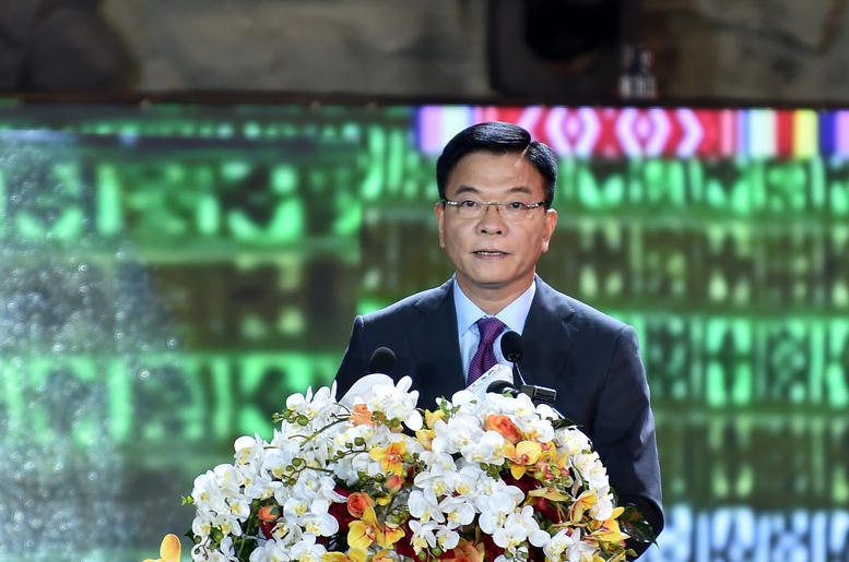 Phó Thủ tướng Lê Thành Long phát biểu tại Lễ đón nhận bằng xếp hạng di tích quốc gia đặc biệt Hang xóm Trại, Mái đá làng Vành và khai mạc Tuần Văn hóa - Du lịch tỉnh Hòa Bình năm 2024 - Ảnh: VGP/Đức Tuân