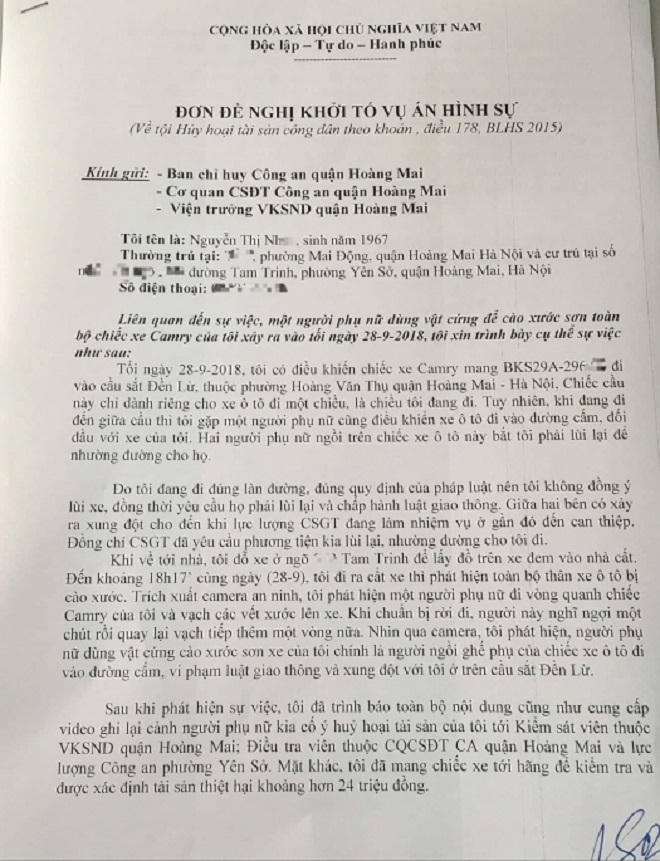 (PLO) - Chị Nguyễn Thị N. (trú tại phường Yên Sở, quận Hoàng Mai, Hà Nội), chủ nhân xe ô tô Camry bị người phụ nữ lạ mặt lén cào xước đã gửi đơn đề nghị VKSND và CA quận Hoàng Mai khởi tố vụ án.