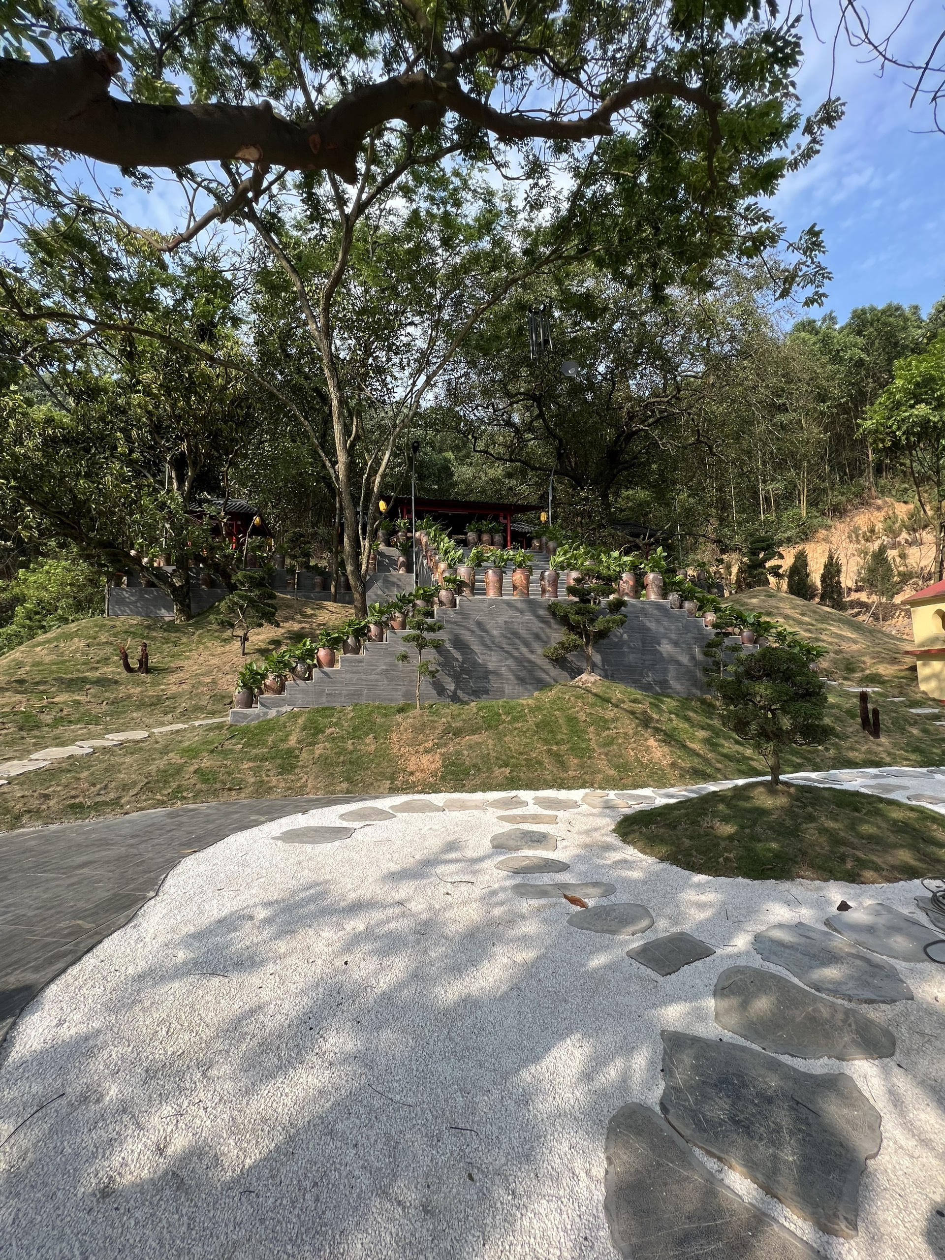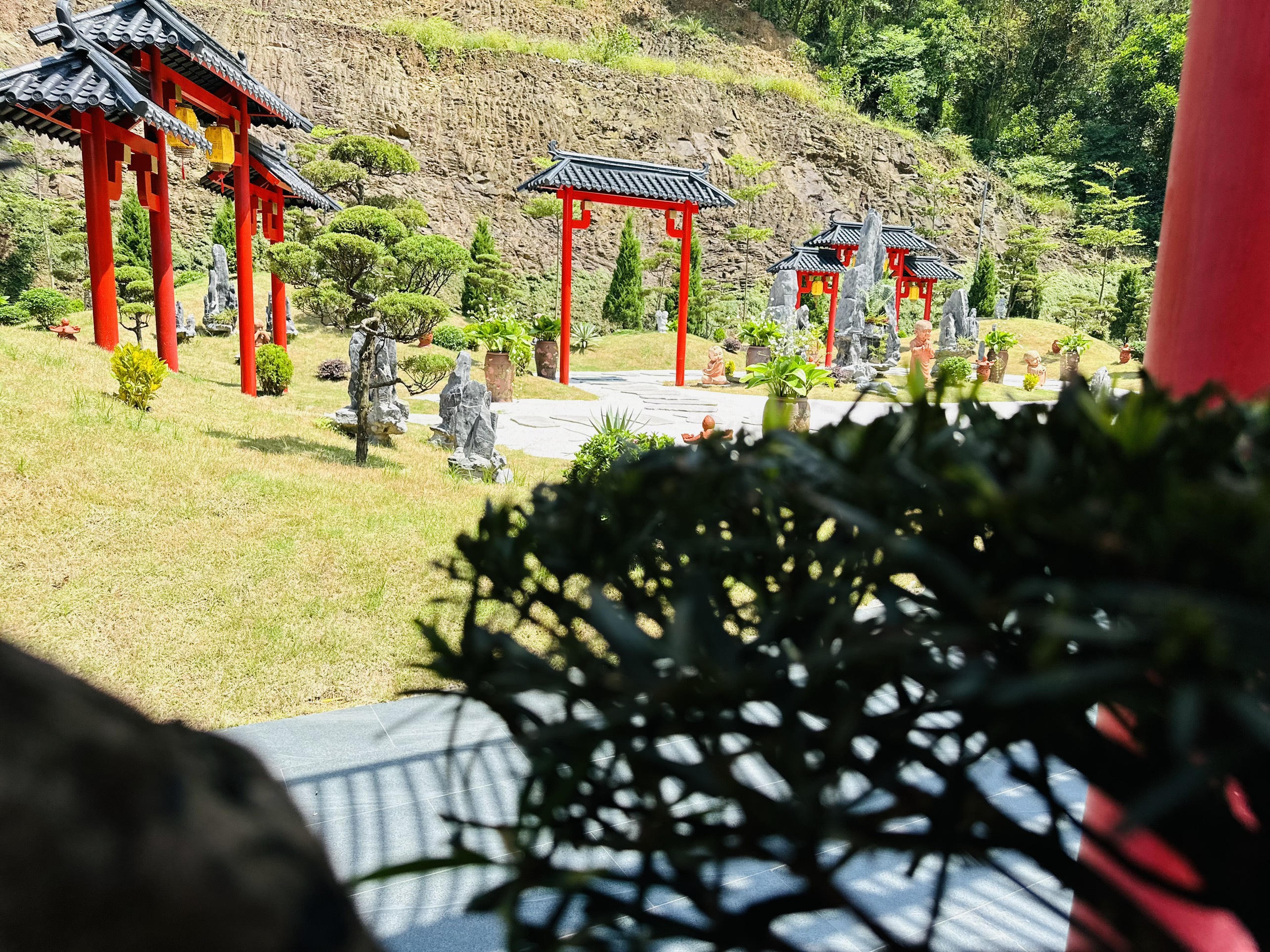 Đến đây du khách sẽ bất ngờ vì phần sân dẫn vào chùa được trải sỏi trắng, xung quanh các ngọn đồi xanh mướt màu xanh của cỏ Nhật đan xen với những cây tùng.