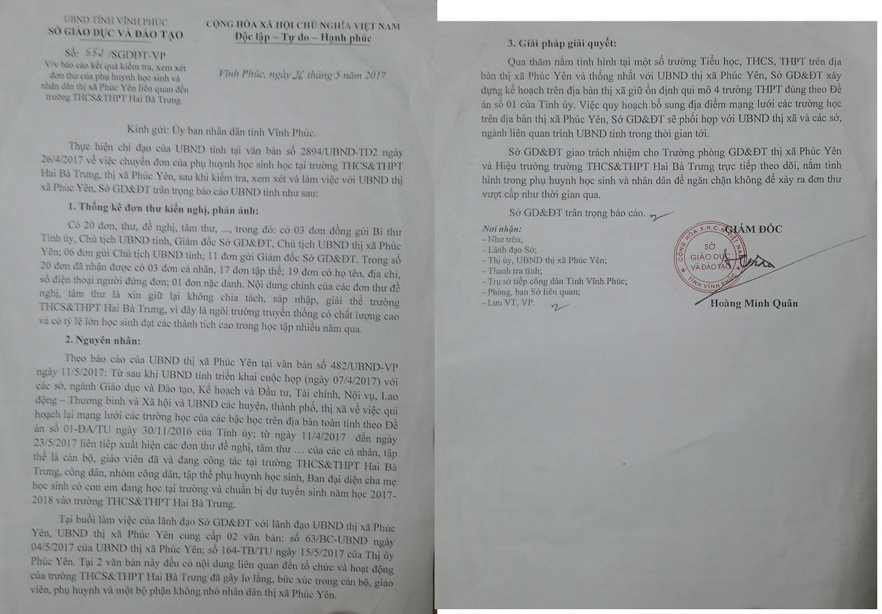 Điều đáng nói, trước đó ngày 14/6/2017, Sở GD&ĐT tỉnh Vĩnh Phúc có quyết định giao chỉ tiêu phát triển giáo dục công lập năm 2017-2018, trong đó Trường Hai Bà Trưng được tuyển sinh 135 học sinh vào lớp 6. Vậy nhưng, đến ngày 26/6/2017, Sở GD&ĐT lại ban hành Công văn số 667/SGDĐT-GDTrH về việc tạm dừng tuyển sinh vào lớp 6 THCS đối với Trường Hai Bà Trưng.