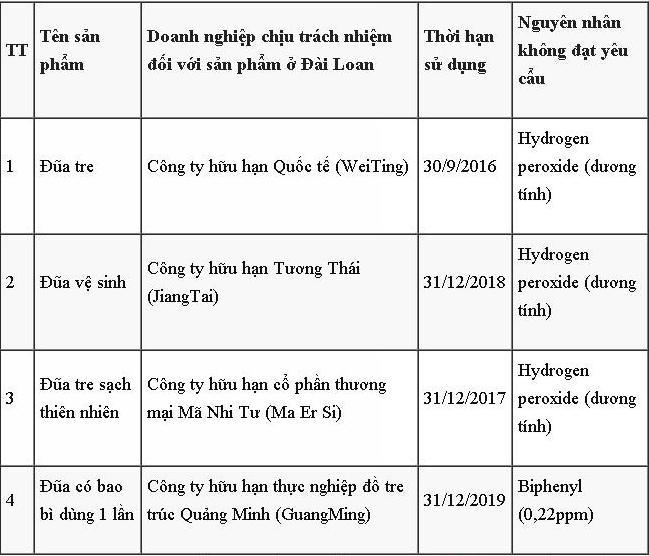 Cụ thể, sau khi nhận được thông tin từ Bộ Y tế Đài Loan về sản phẩm đũa dùng 1 lần của Việt Nam tại Đài Loan có chứa chất tẩy trắng hydrogen peroxide và biphenyl gây nguy hại cho sức khỏe người tiêu dùng, Cục An toàn thực phẩm đã yêu cầu Viện Kiểm nghiệm An toàn vệ sinh thực phẩm Quốc gia lấy mẫu các sản phẩm đũa dùng 1 lần trên thị trường để kiểm nghiệm các chất tẩy trắng, kết quả cho thấy 10 mẫu đũa lấy trên thị trường đều âm tính với chất tẩy trắng mà Đài Loan phát hiện.