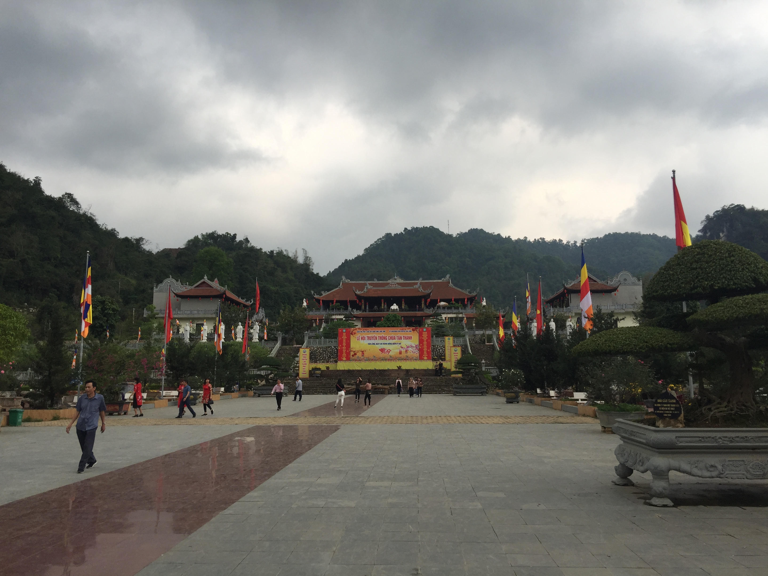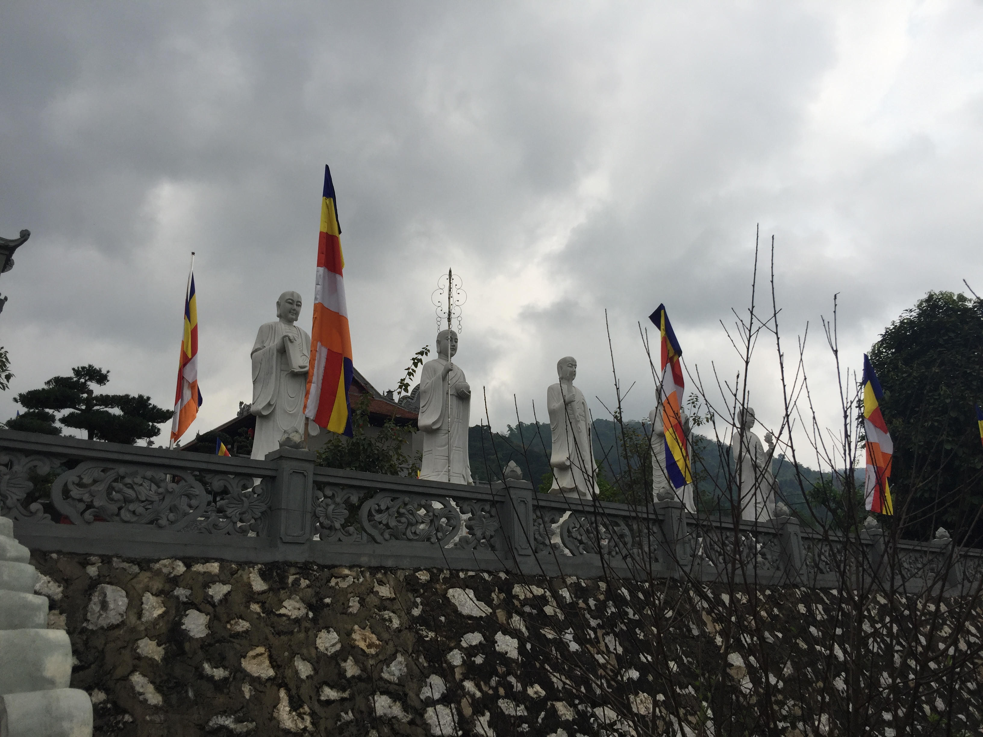 Để lên được trung tâm chùa phải đi qua một sảnh lớn rộng 2000 m2,với trục hoàng đạo thẳng tắp, hai bên là hàng tùng La hán. Cổng Tam quan nơi treo quả chuông đồng nặng 536kg sớm, chiều ngân nga giữa điệp trùng non nước. Hai hàng tượng mười vị đại đệ tử của Đức Phật Thích ca; mỗi vị là tiêu biểu cho các đức tính và đạo hành từ bi của Phật, bằng đá trắng Ngũ Hành Sơn được chạm khắc sống động.