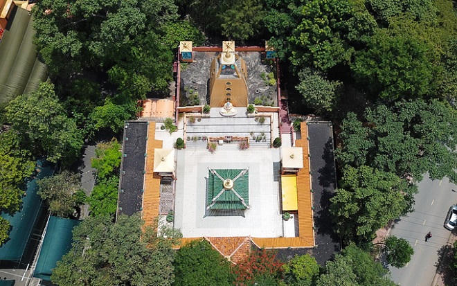 Chánh điện bao quanh bởi vườn cây cao vút, có cấu trúc hình khối vuông, điểm nhấn là ngôi bảo tháp thờ xá lợi và các tứ giác có chiều cao trên 15 m.