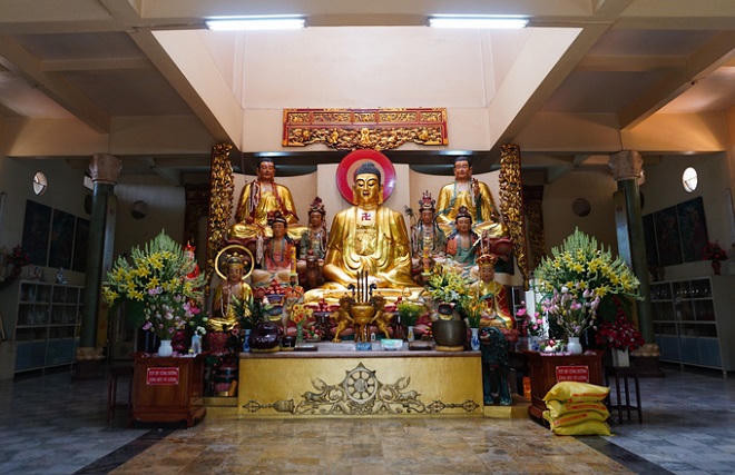 Ở giữa chánh điện thờ tượng Phật Thích Ca ngồi thiền có chiều cao 2,3 m. Xung quanh có chư Phật và Bồ tát ở các vị trí khác nhau.