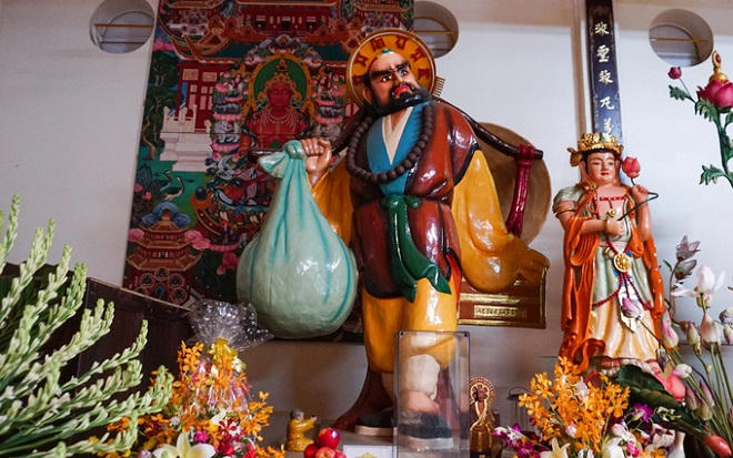 Điểm thú vị là trên đòn gánh của ngài còn treo một chiếc nón lá mang đậm chất văn hóa dân tộc.