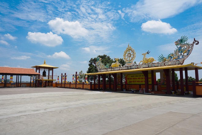 Trên sân thượng là khoảng không gian rộng rãi, thoáng gió để ngắm toàn cảnh chùa Tây Tạng cũng như một phần thành phố Thủ Dầu Một.