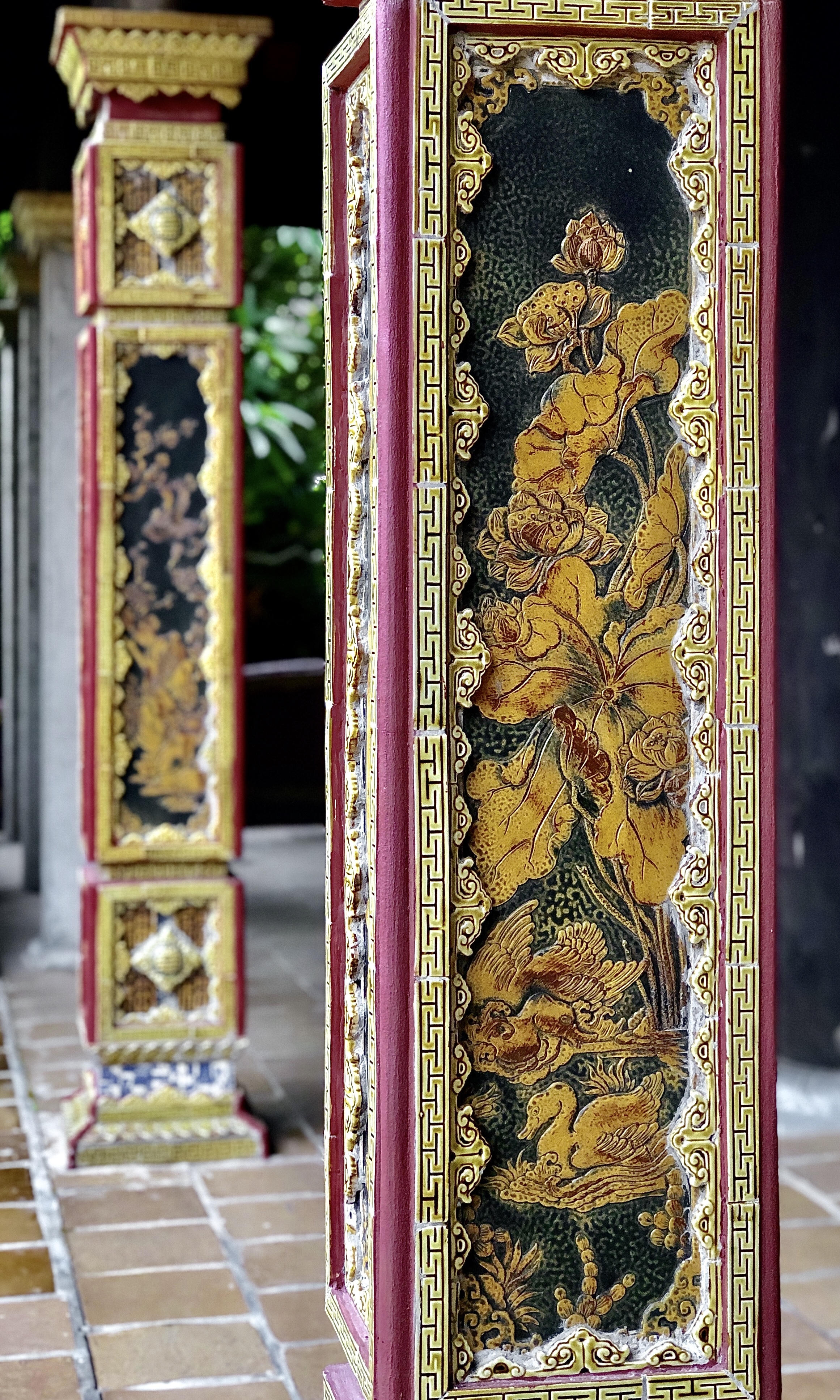 Cột trụ bên ngoài gian thờ Thập Bát La Hán không chỉ là cột trang trí mà còn là bức tranh họa tiết rồng xanh uốn lượn - một hiện vật nghệ thuật độc đáo.